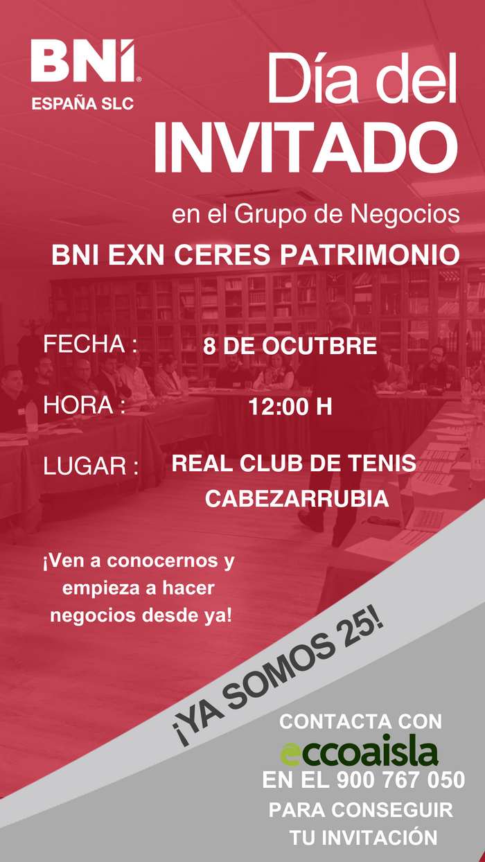 INVITACIÓN GRUPO DE NEGOCIOS BNI CERES PATRIMONIO - CÁCERES, 8 OCTUBRE A LAS 12:00 HORAS